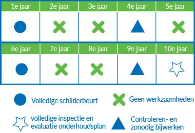 Over 3 jaar: controleren en zo nodig bijwerken. Over 5 jaar: controle voor het eventueel opnieuw schilderen van uw huis.